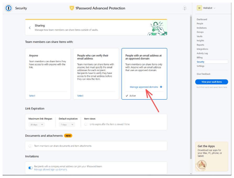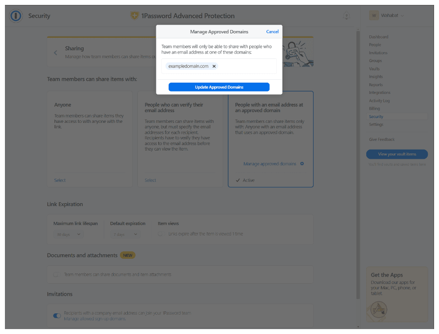 For additional security, we recommend you to setup specific approved domains, so you know who can access the links that your team shares.
