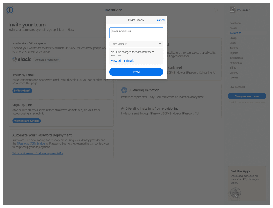 We highly recommend to read through the onboarding your team guide provided by 1password, but we’ll guide you through the basic steps to invite your team either way.